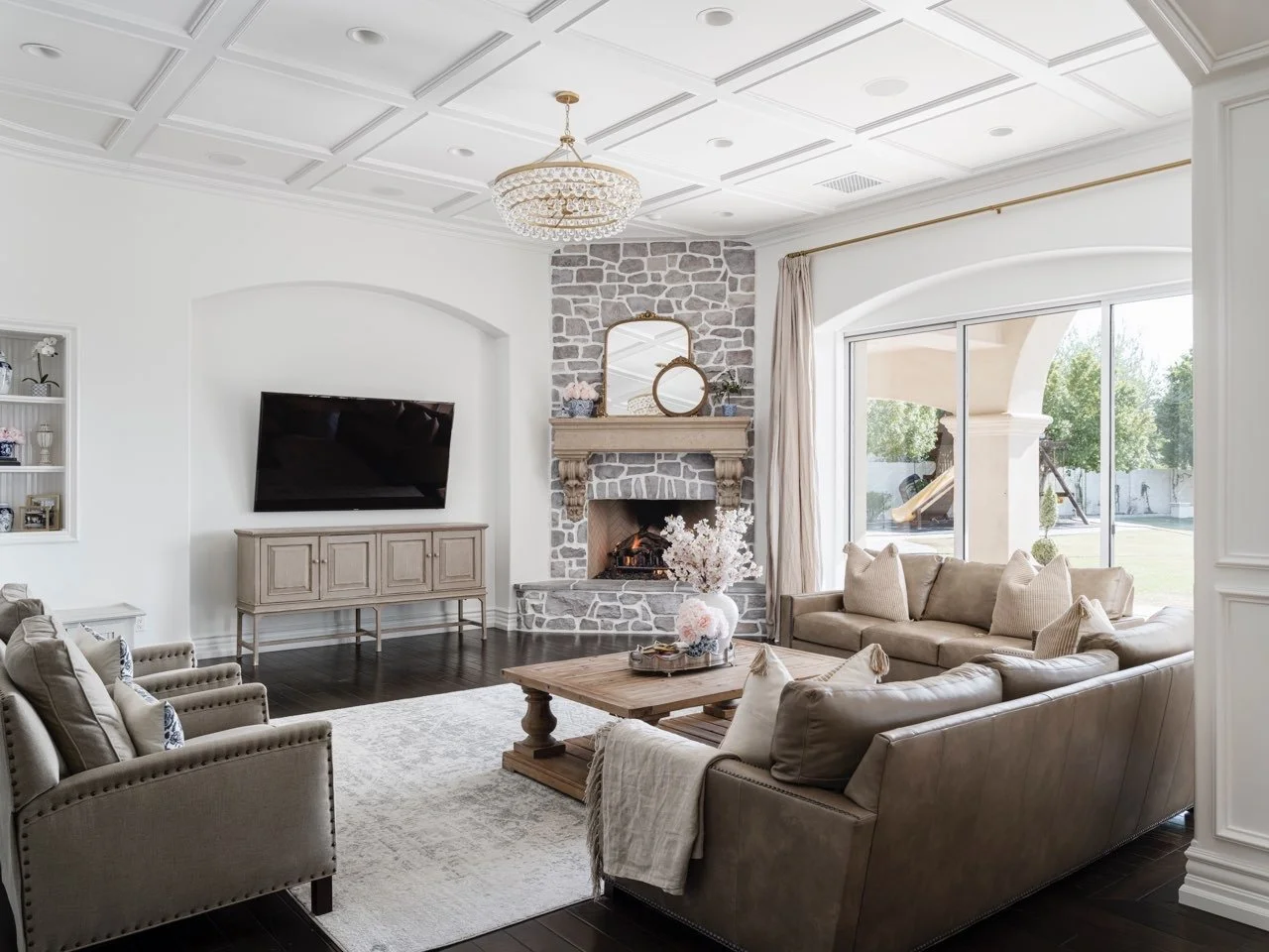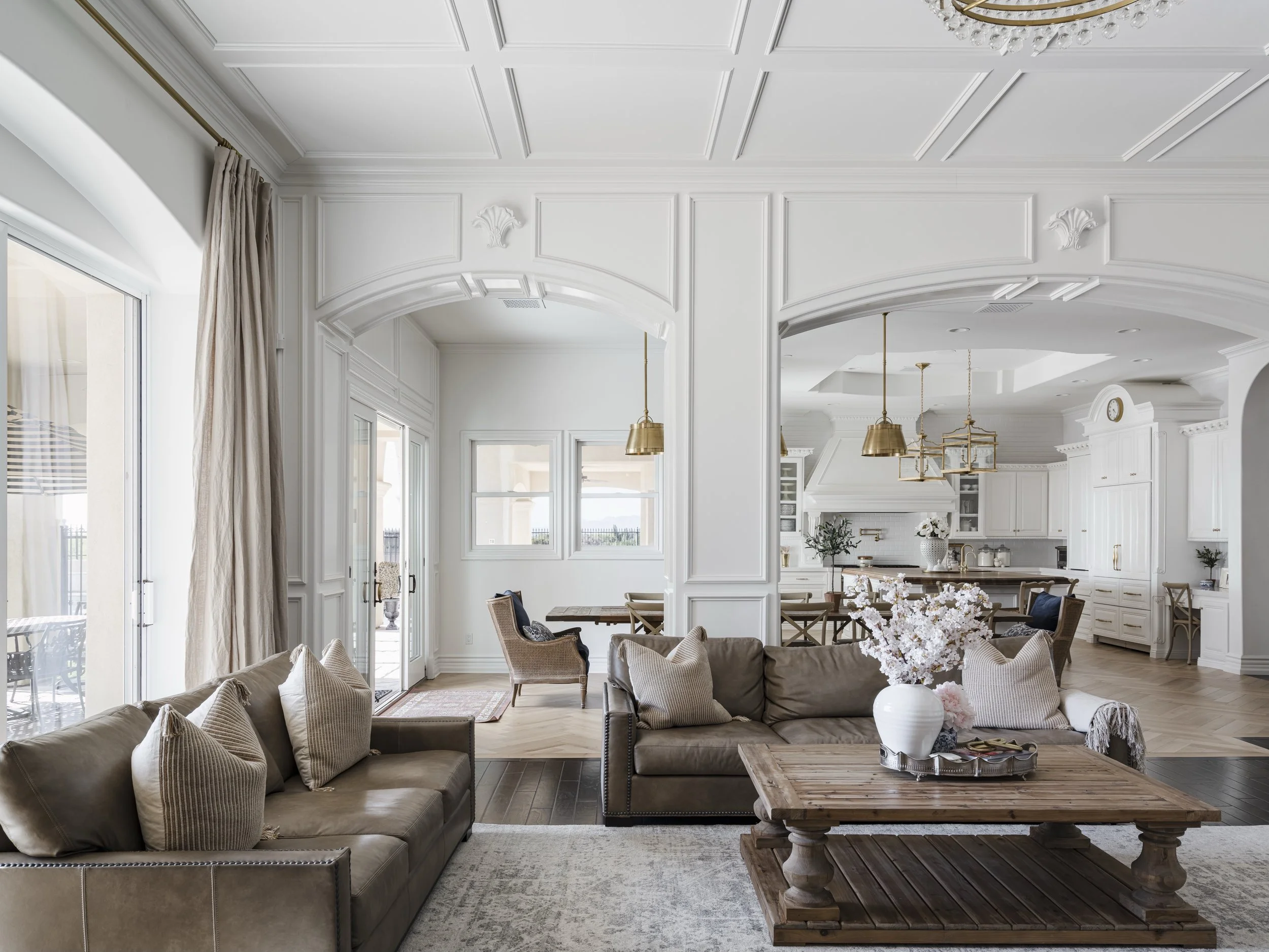 In the Family Room, the updates continued with custom Belgian linen curtains, soft mushroom-toned leather sofas, and a glass-and-brass chandelier that added warmth and depth. The palette was serene and organic, grounded in whites and wood tones that connected beautifully to the nearby cabinetry.
