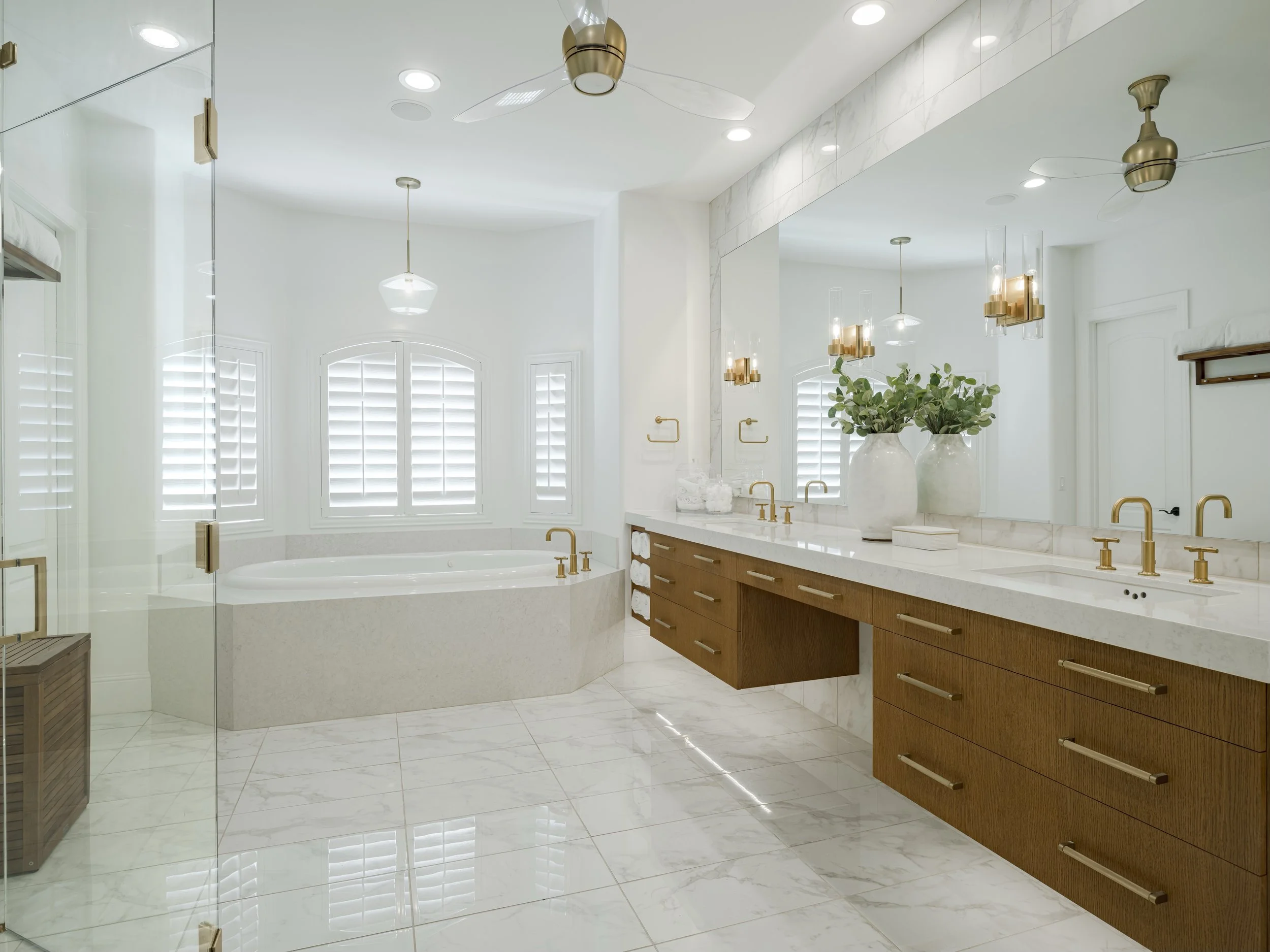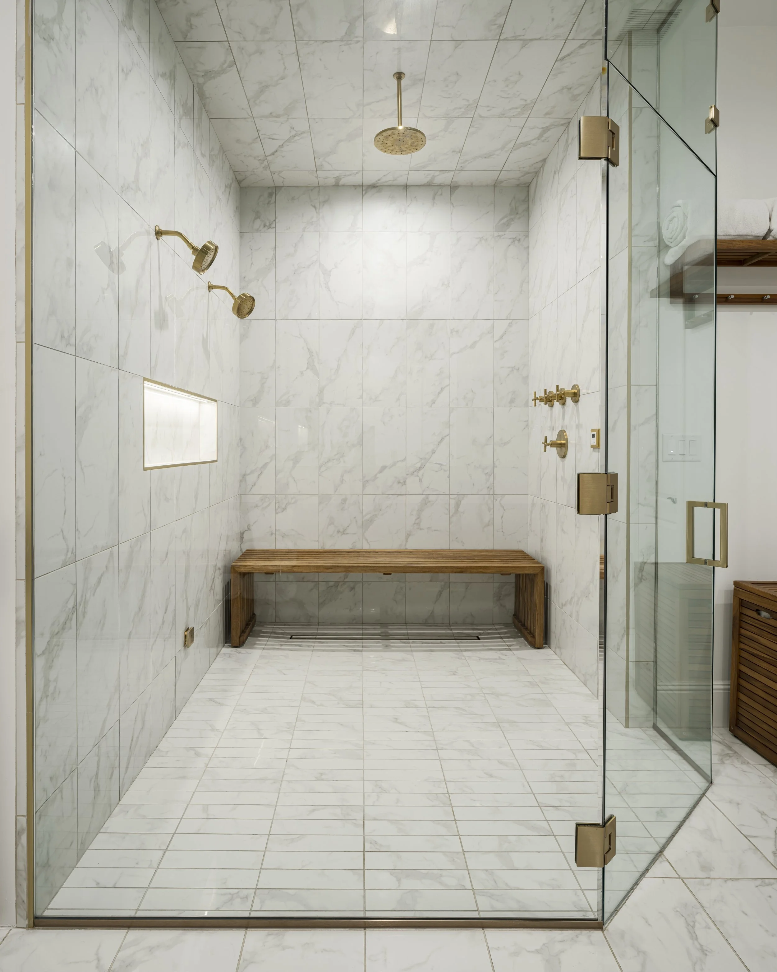 The adjoining Primary Bathroom underwent a transformative redesign. Originally enclosed by walls, the oversized steam shower was opened up with full-height glass panels, making the room feel expansive and spa-like. A floating teak vanity with integrated side shelving replaced the previous tiered countertops, creating visual calm and storage simplicity. Matching teak elements, a custom shower bench, and rolled towel niches added both luxury and warmth. Vertical stack-bond tile in soft golden hues created a clean, refined backdrop,expertly installed by Lux Group. A mix of ambient and practical lighting, including a brass-and-acrylic fan and soft LED strips under the vanity and in the shower niche, brought both mood and function to morning routines.