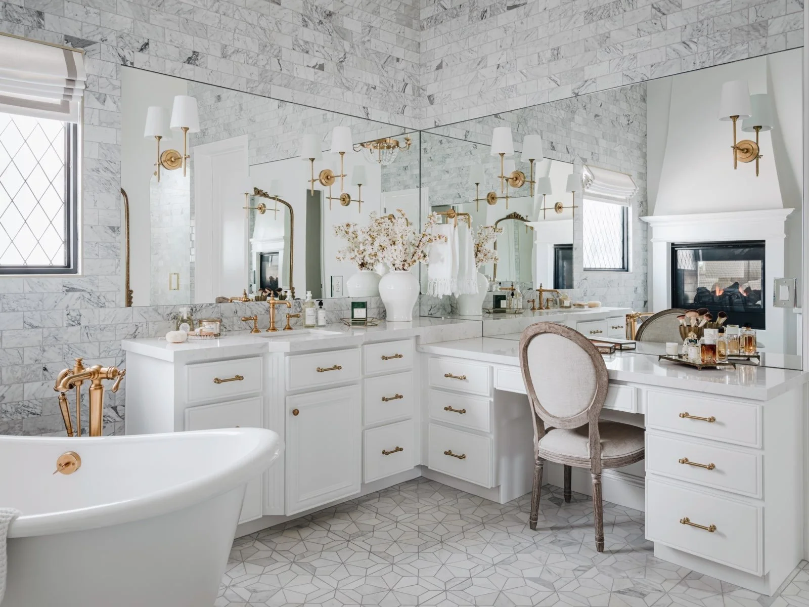 The Primary Bathroom was equally transformative. Ashley replaced a dated glass block wall with an arched shower entry, framed by two brass towel hooks. Marble was used generously, from mosaic floors to herringbone shower tile, and full-height walls for a luxe, spa-like feel. Cambria countertops, a Kohler clawfoot tub with a floor-mounted faucet, and the Paris Flea Chandelier brought in timeless elegance. Even the original window was replaced with a custom pane and softened with a tailored Roman shade and valance.