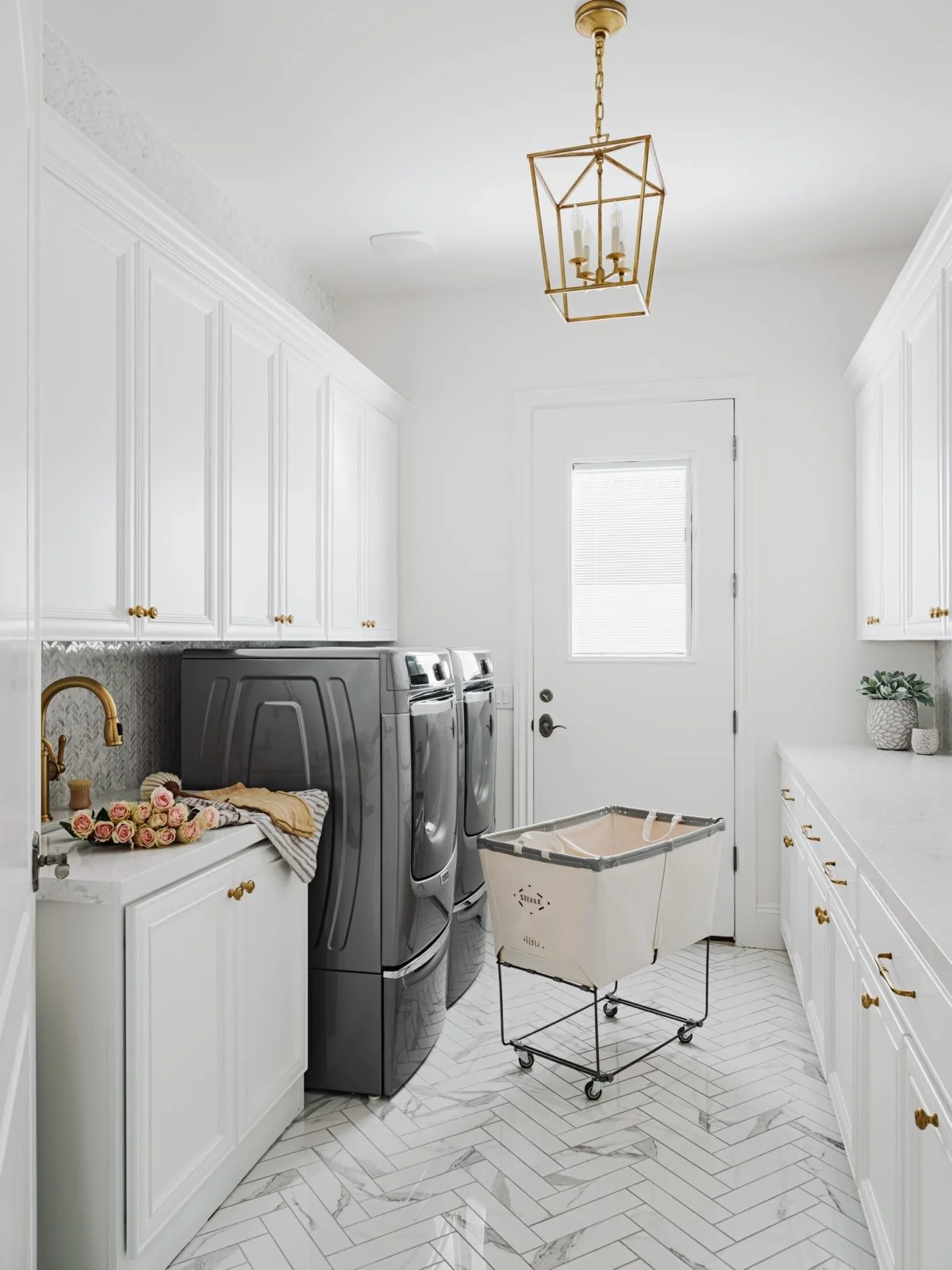 Phase One included the Entry, Great Room, Movie Room, Kitchen, Family Room, Laundry Room, three children's bedrooms, and three bathrooms. The design emphasized elevated materials that could keep up with a family who loves to host. Light wood flooring set the tone throughout, paired with brass lighting fixtures that became instant focal points. Trim details were added to accentuate key spaces, while existing cabinetry was repurposed with fresh paint and updated hardware, each room with its own distinct touch. Quartzite countertops added both beauty and durability throughout.
